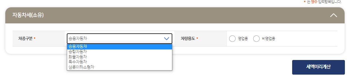 지방세 미리계산으로 들어가게 되면 여러항목이 나오는데 그 중 자동차세를 선택하시고 차종과 차량용도 영업용 비영업용 중에서 체크하시면 됩니다.