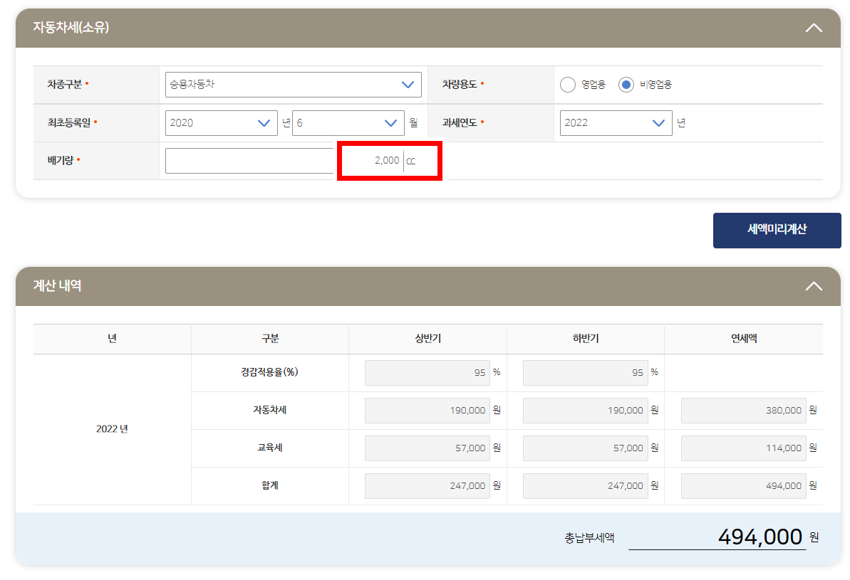 비영업용 기준으로 차량 배기량에 따른 금액을 확인하시게 되면 배기량xcc당 금액에 지방세 130%를 추가하면 나의 자동차세입니다.