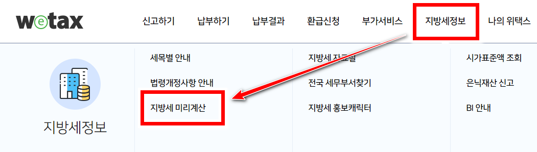 위택스에 접속을 하게 되면 상단 메뉴에 지방세 정보항목을 클릭하시면 지방세 미리계산이 보입니다. 이동을 하시면 됩니다.